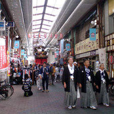 朝9時半頃に神明社を出発し、笛と太鼓のお囃子を奏でつつからくり人形を舞わせつつ、四間道(しけみち)という何とも情緒豊かな界隈を通り抜け、やがて二福神車は円頓寺商店街というアーケード街を東西に抜けます。写真はその時の模様ですね。ああ、ついでながらわたくし、この辺に住んでます。