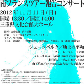 宣伝です。先月南フランス・ツアーに同行させて頂きましたVocal Ensemble 《EST》の第20回定期演奏会が、2012年11月11日、三重県文化会館大ホールにて開催されます。開演14:00。